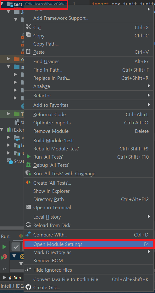 위와 같은 창이 뜨고, 빨간 네모에 적힌 순서대로 눌러 Test 디렉터리를 Test 디렉터리로 마크해주면 된다.