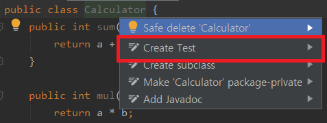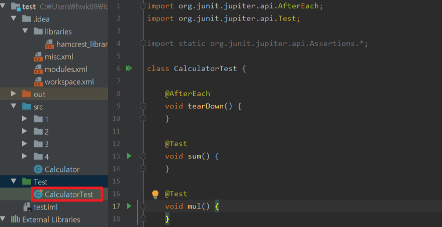 위와 같이 CalculatorTest 클래스가 생성되었다.
