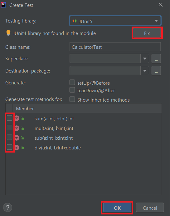 설치가 끝났다면, 유닛 단위 테스트를 진행할 메서드들을 체크한 뒤, OK를 눌러